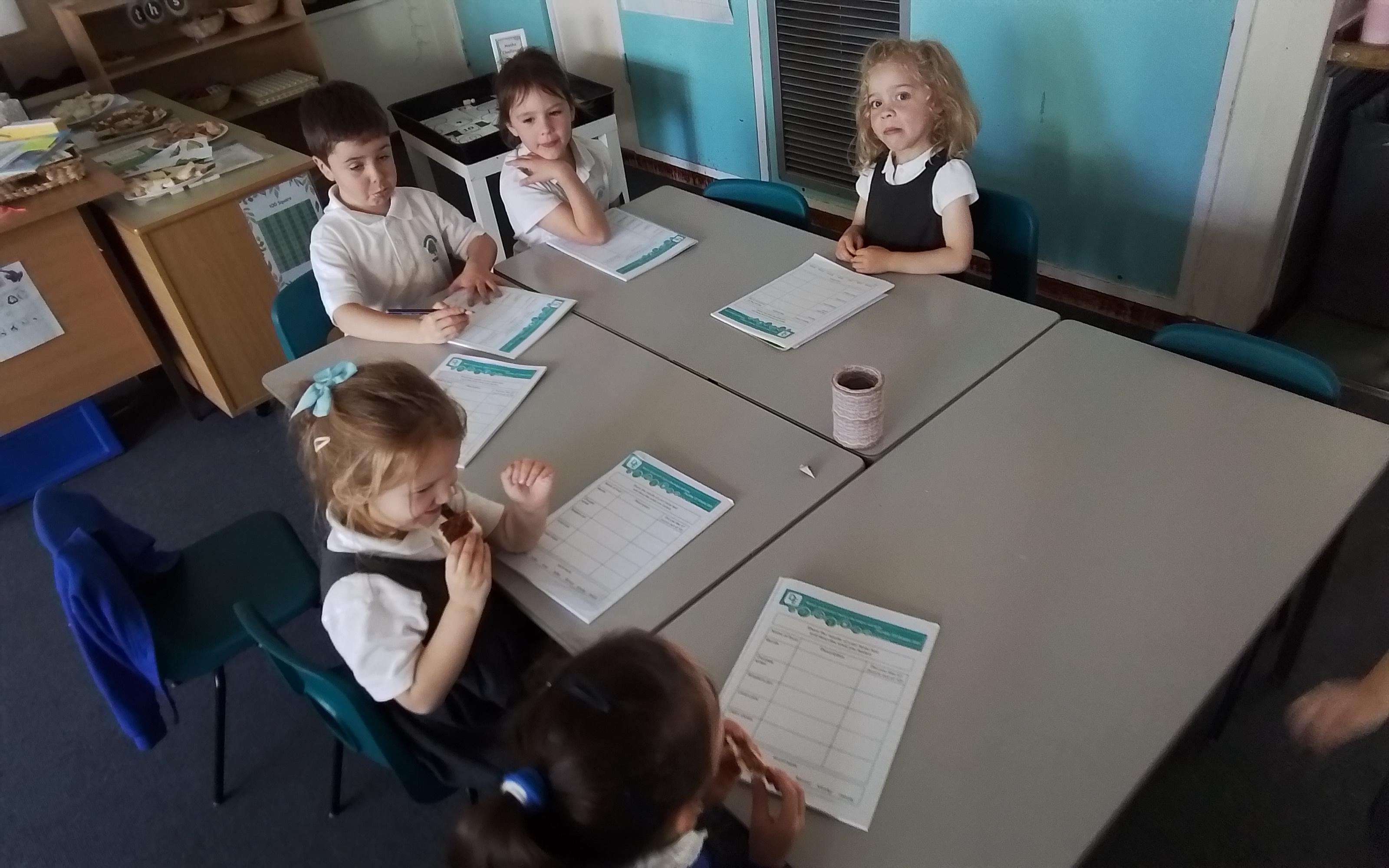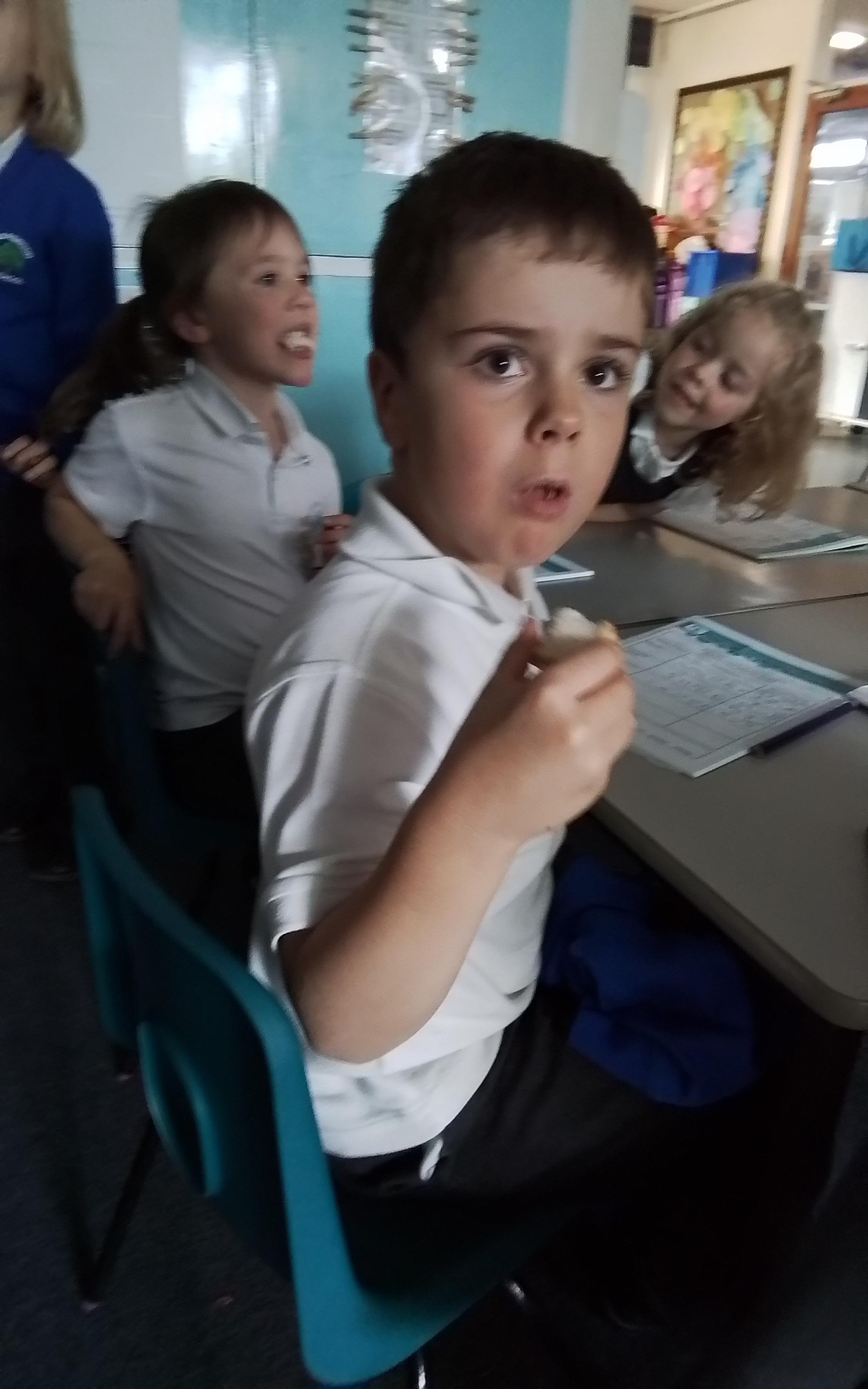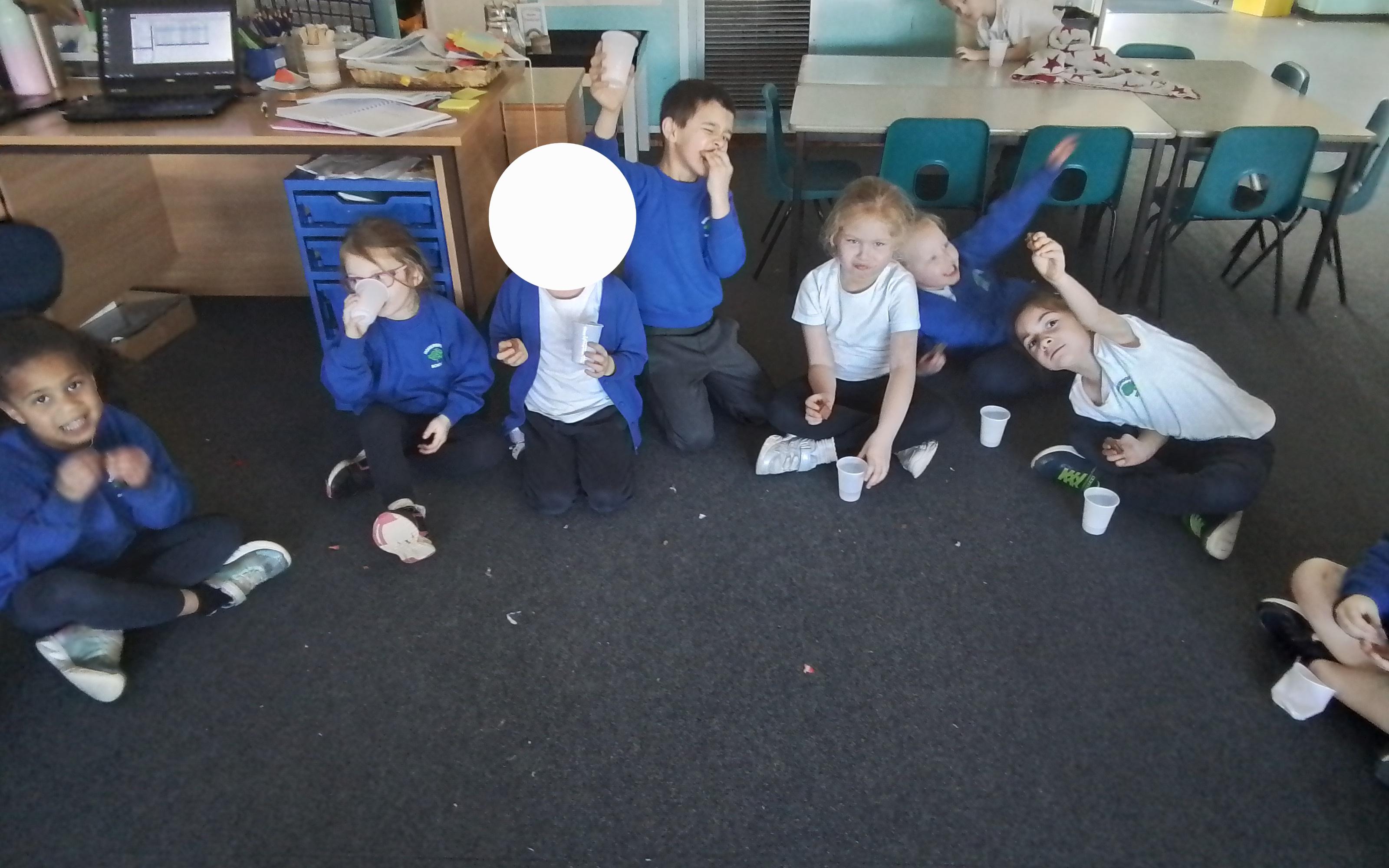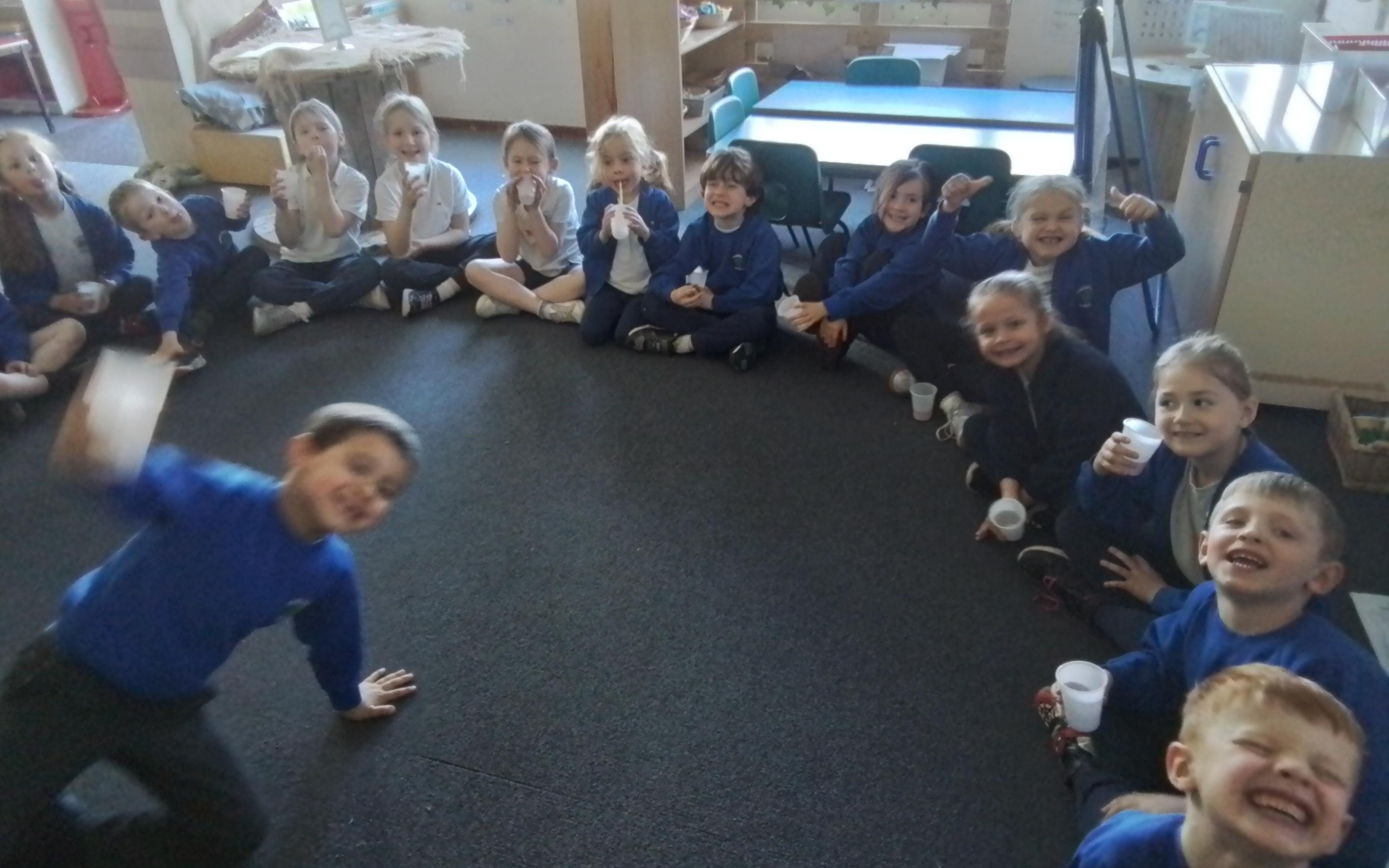 Year 1 enjoying a juice and biscuits treat from a Wonka chocolate prize!