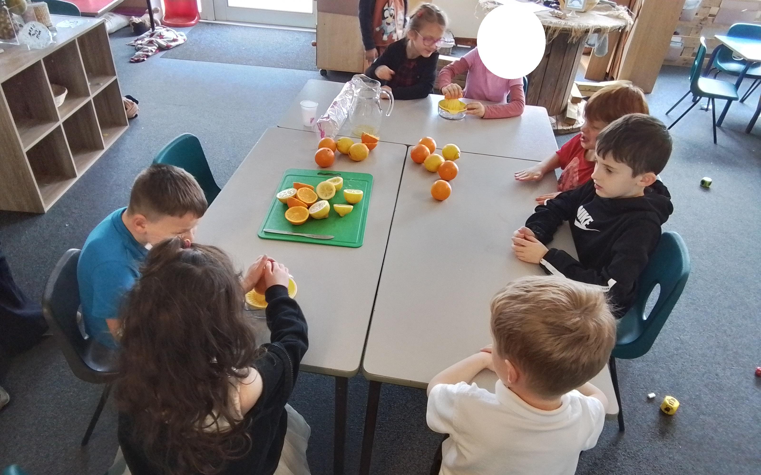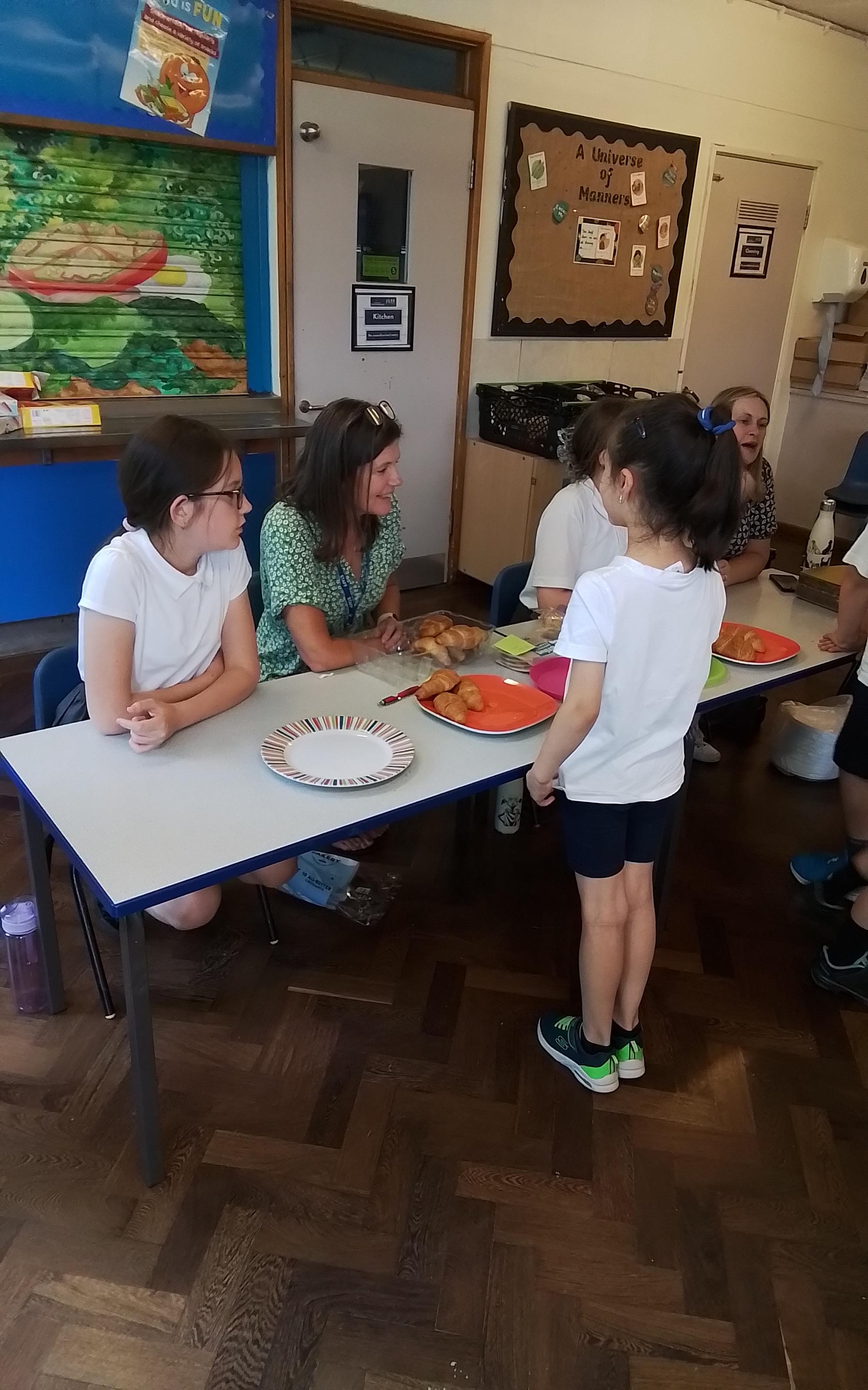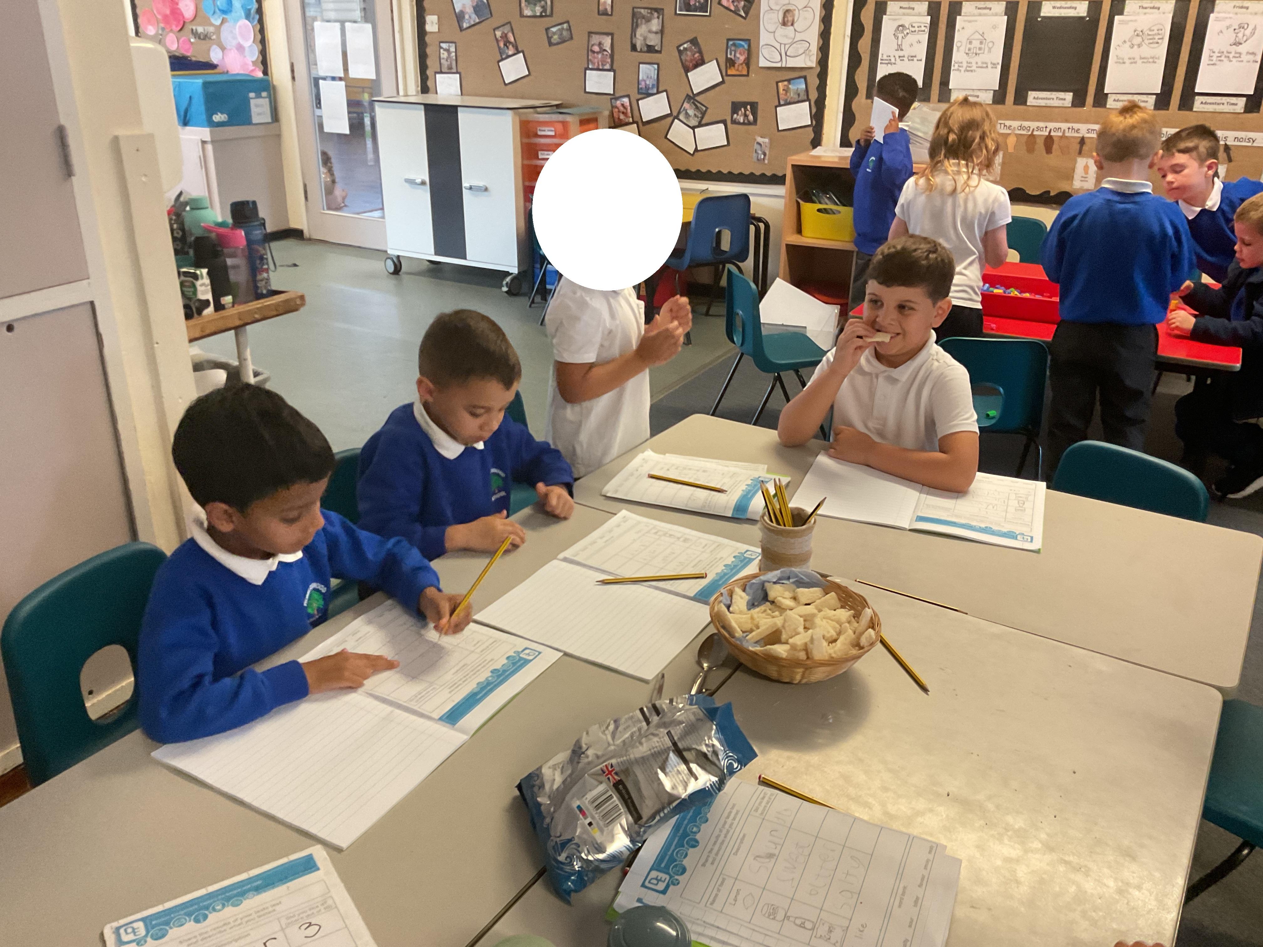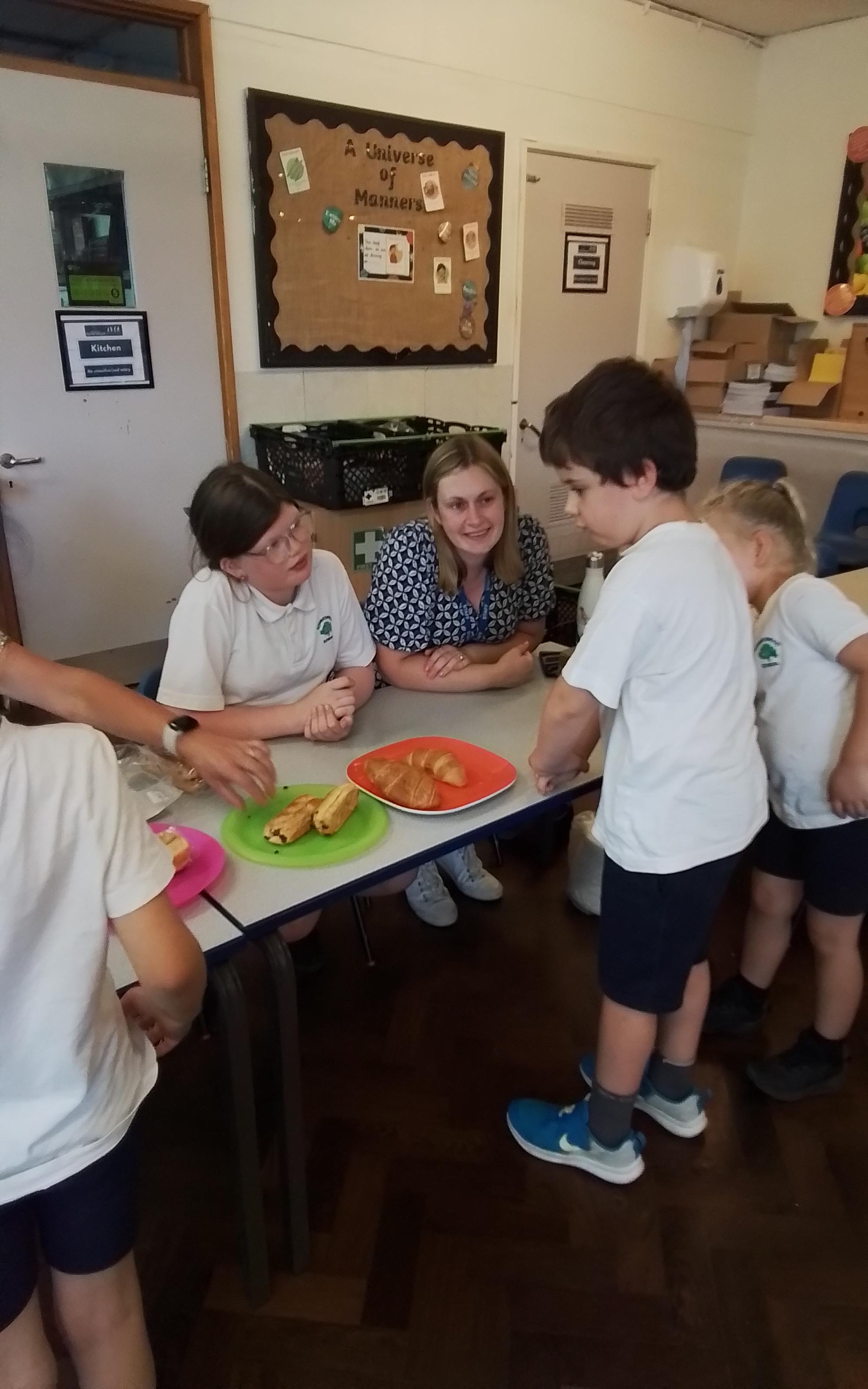 Year 1 enjoying a juice and biscuits treat from a Wonka chocolate prize!