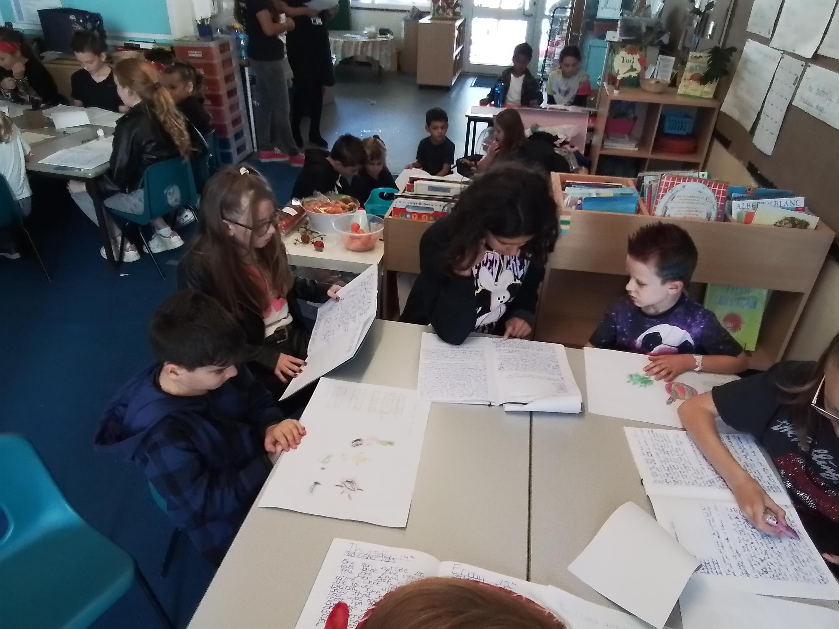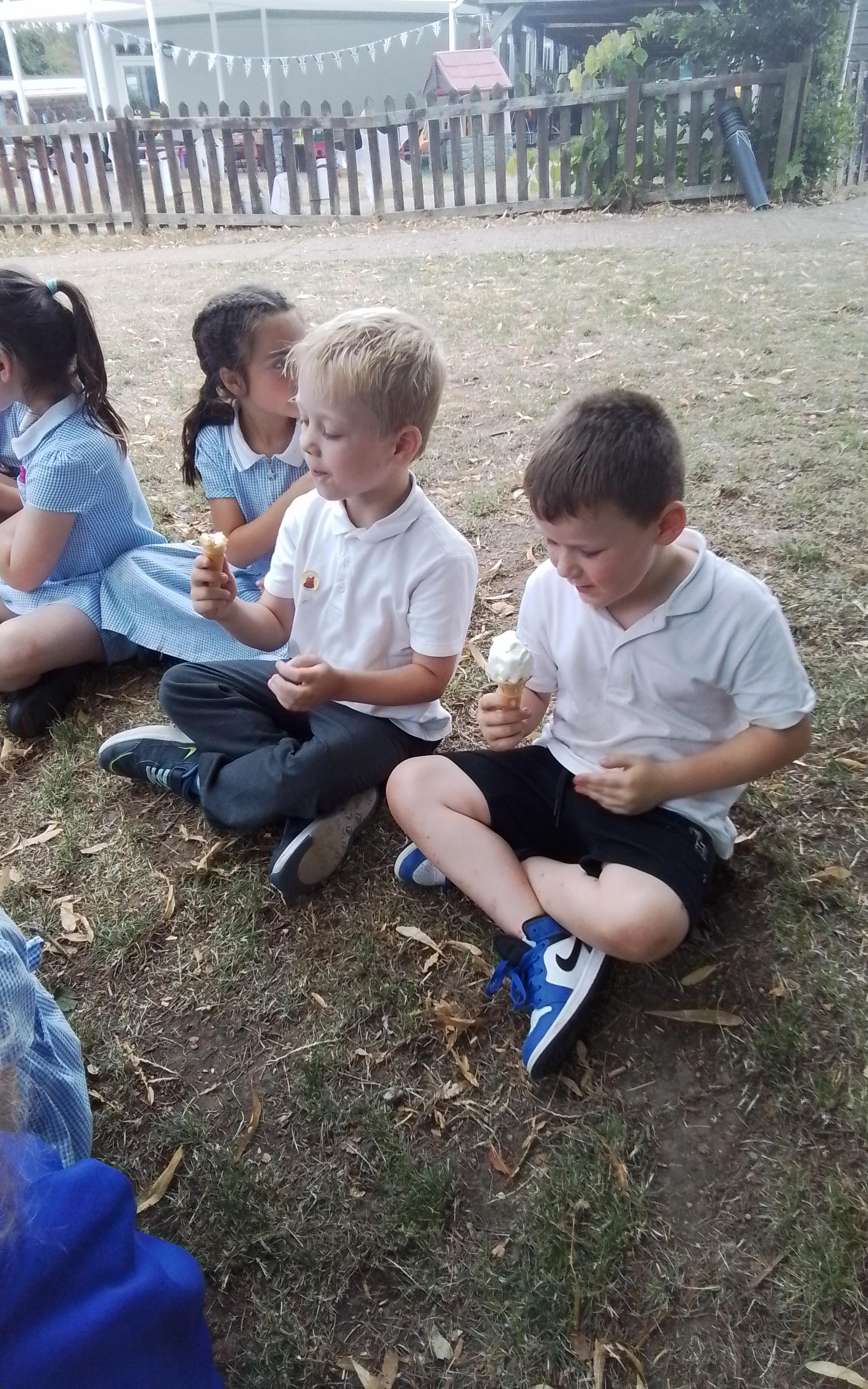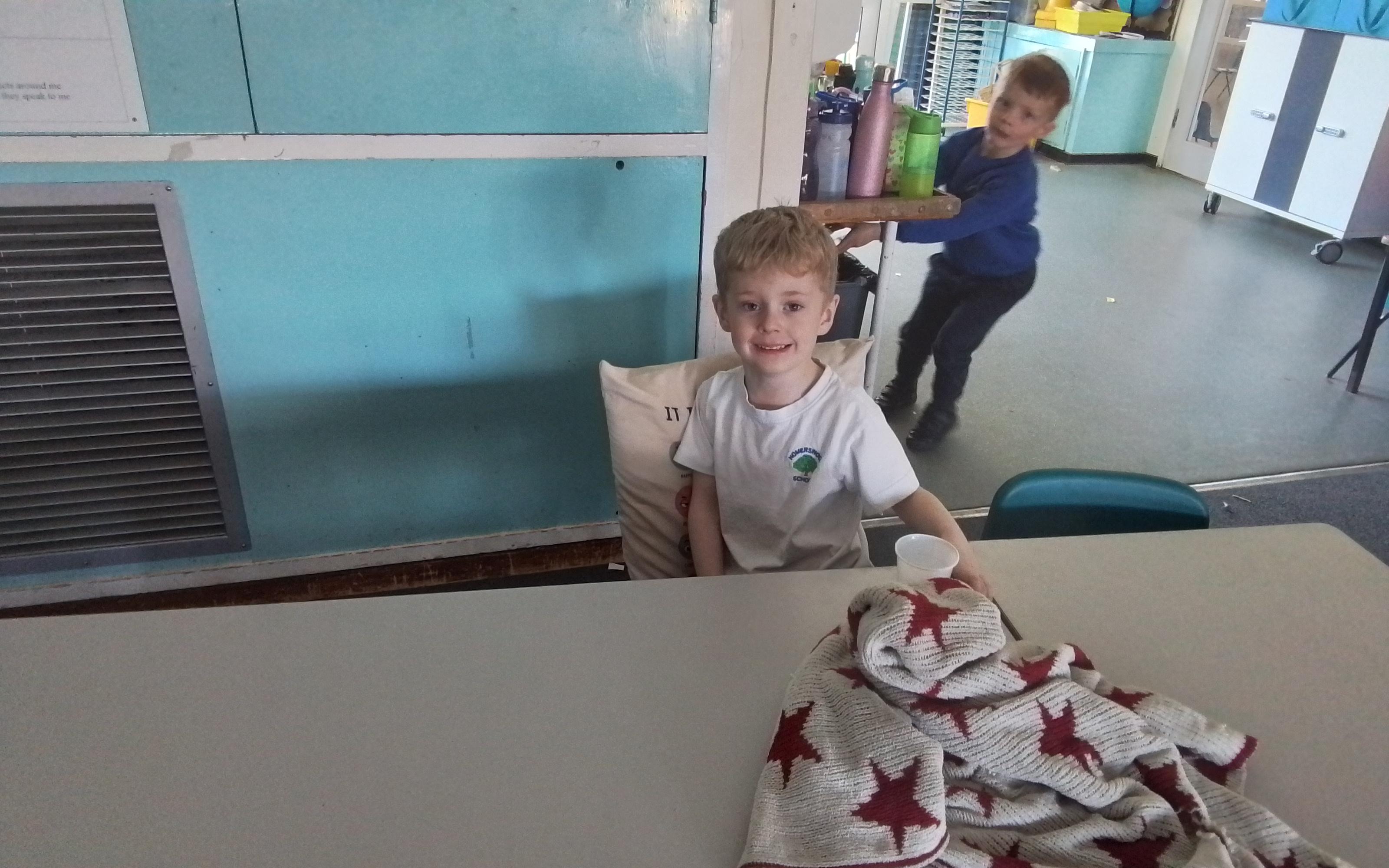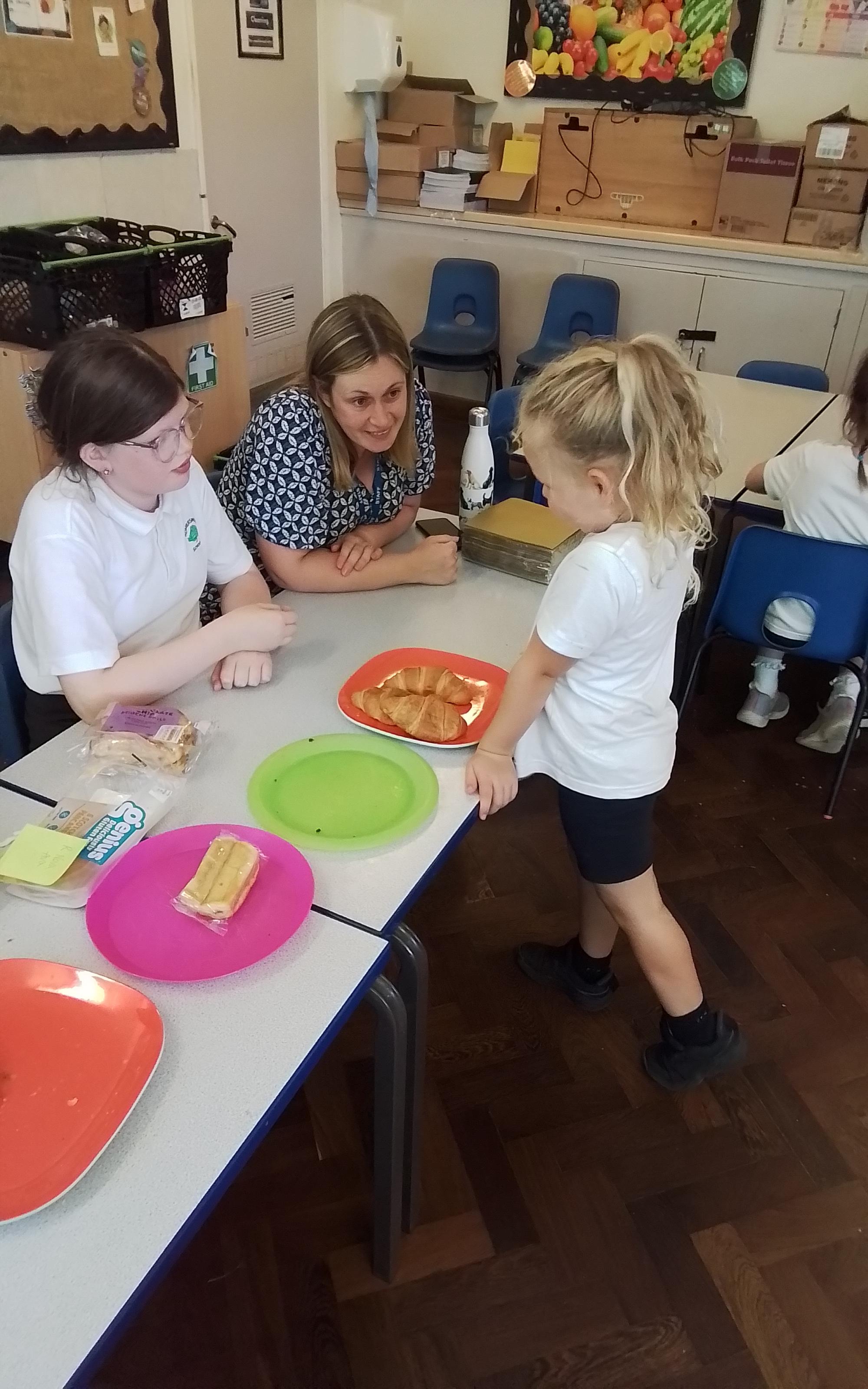 Year 1 enjoying a juice and biscuits treat from a Wonka chocolate prize!