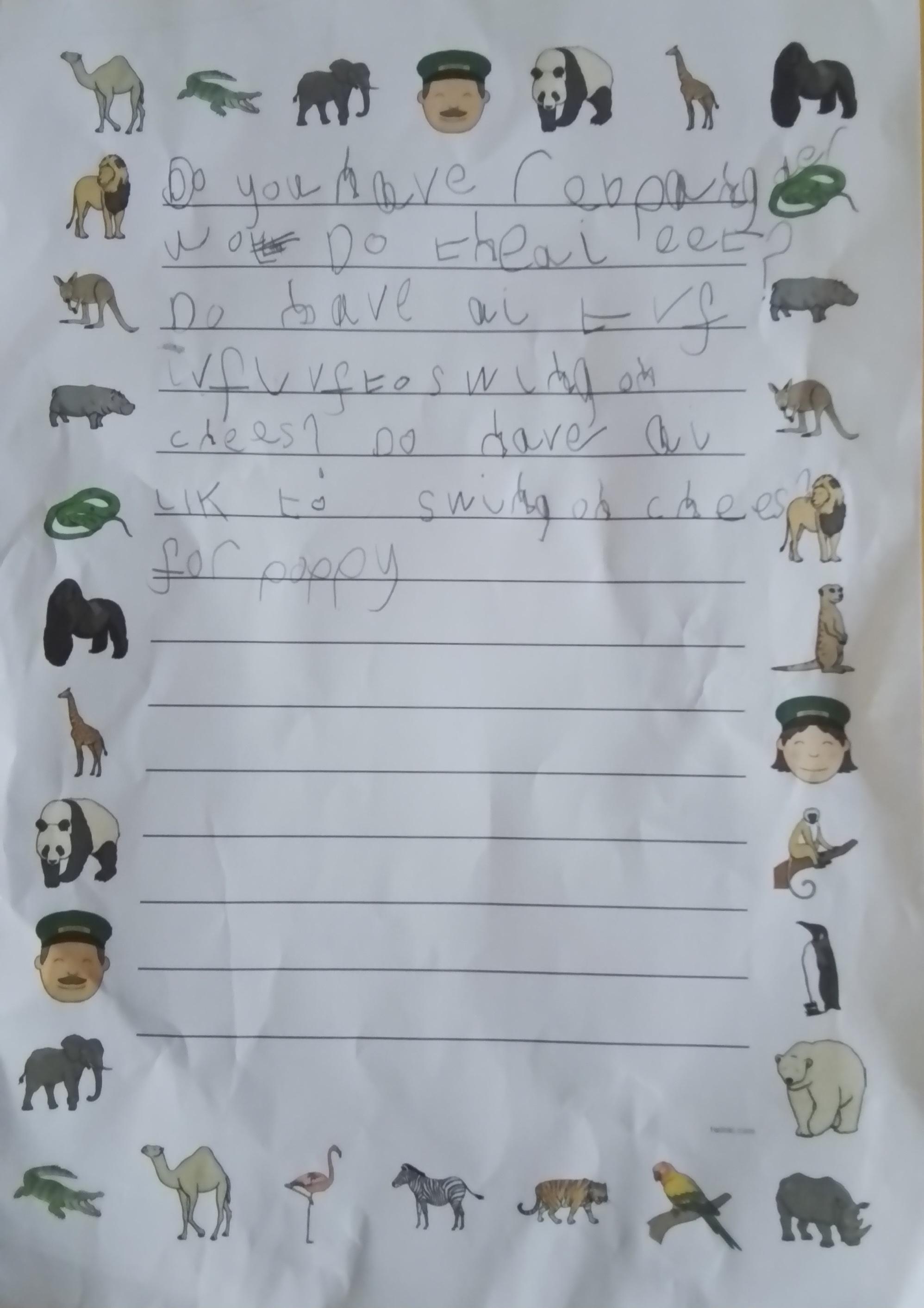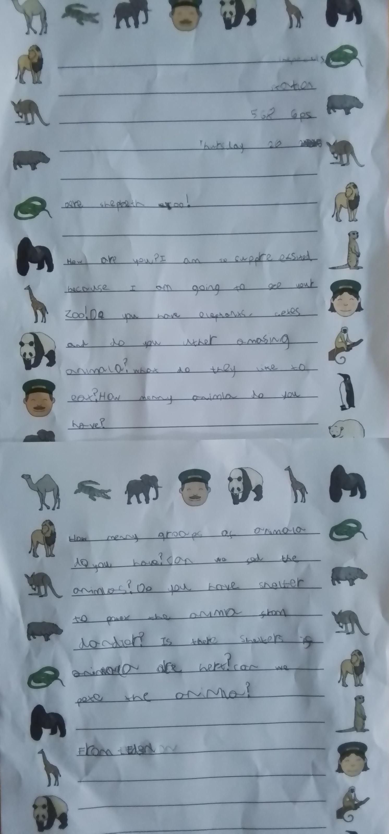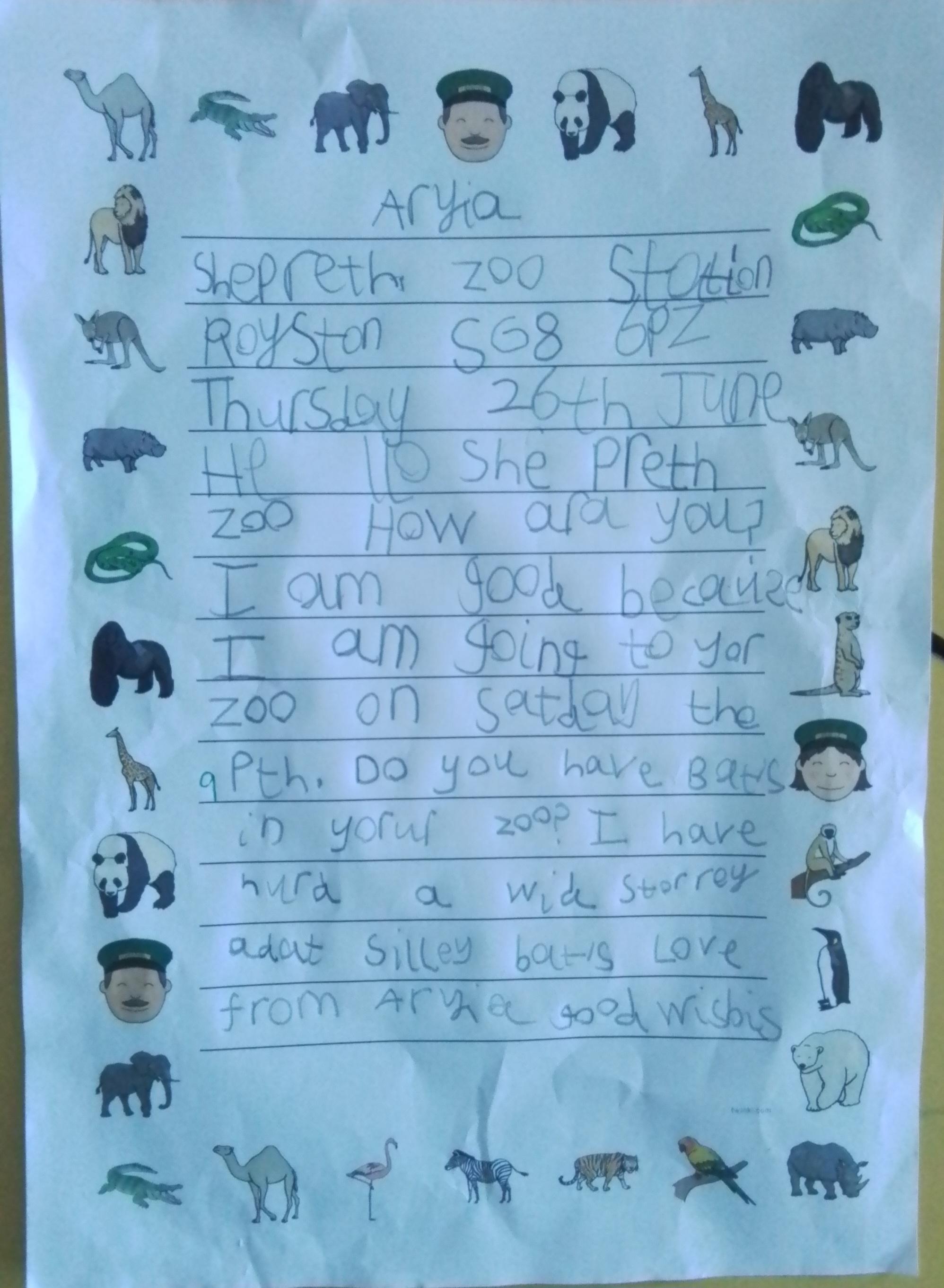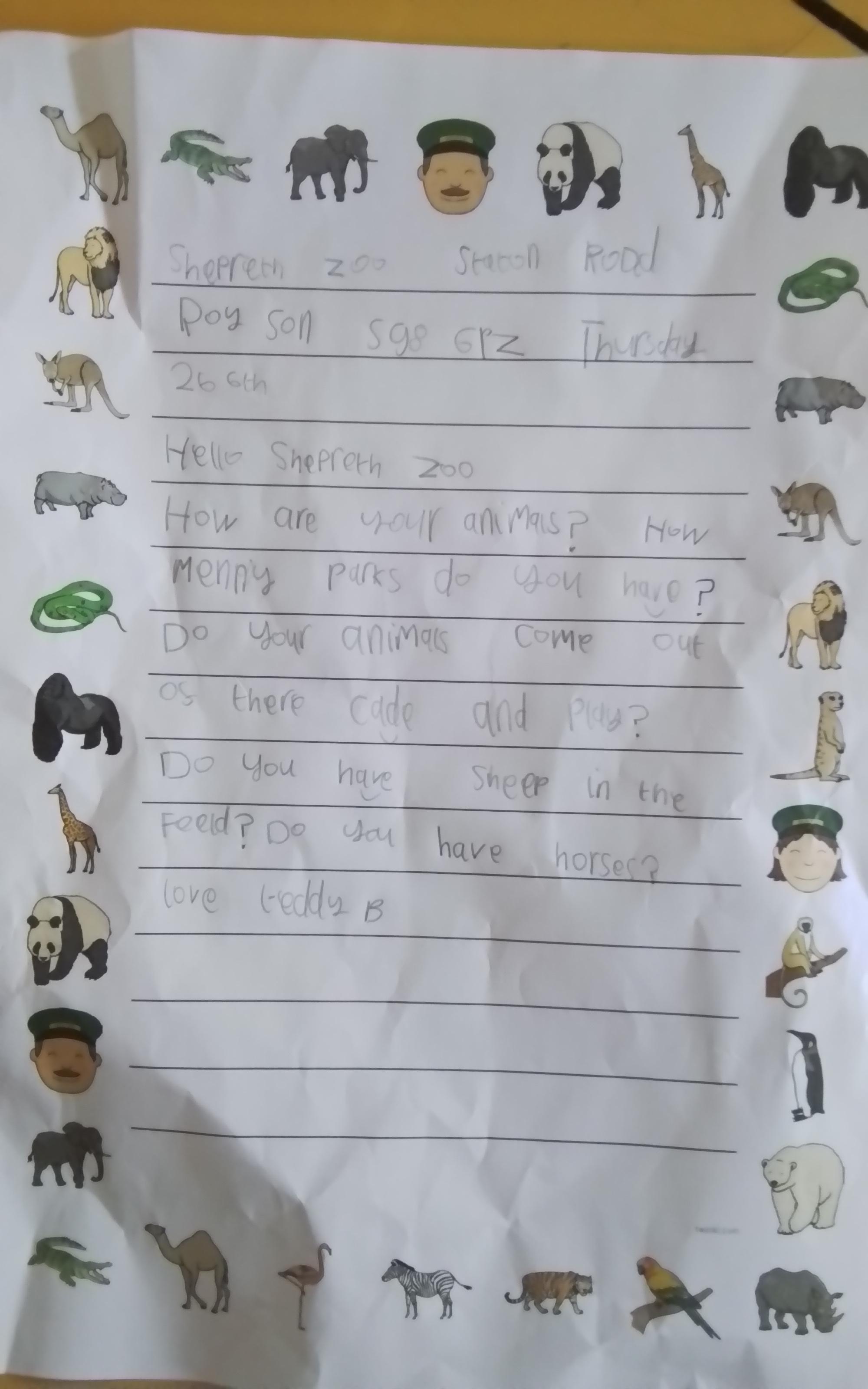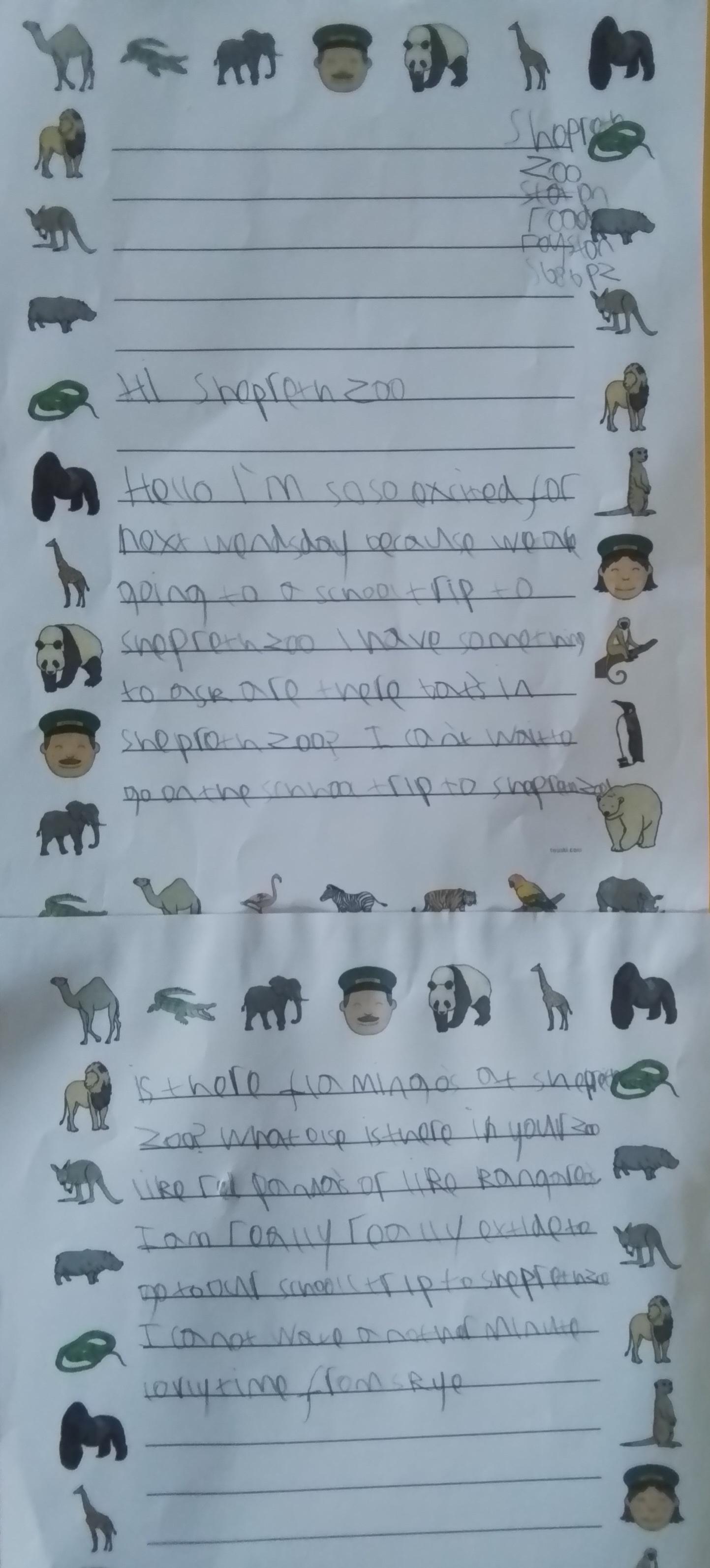 English - Year 1 have been working super hard again this week and have written a letter to Shepreth Zoo. The children wanted to write letters to find out about some of their animals before our trip. Look at their lovely writing! Well done, Year 1!