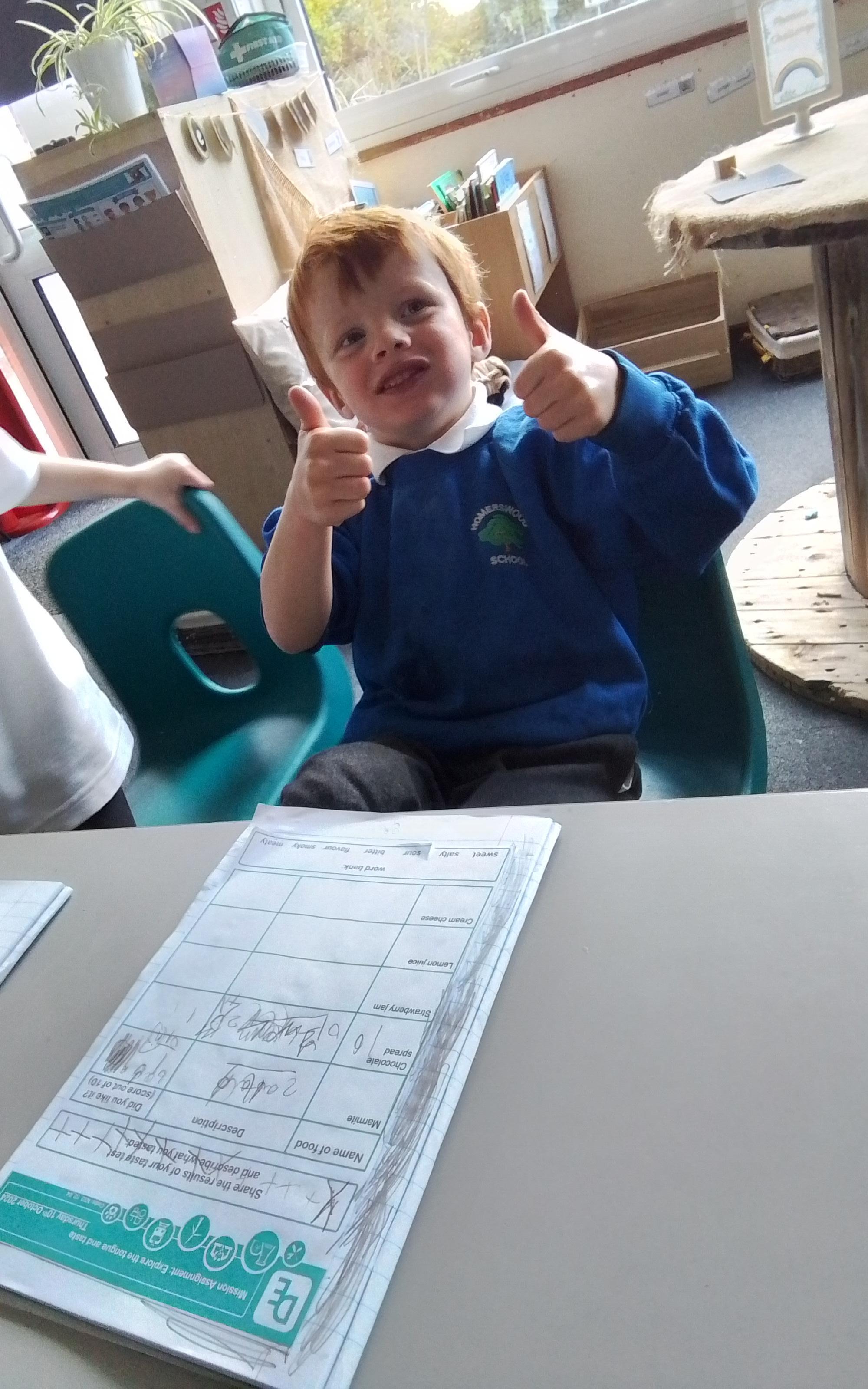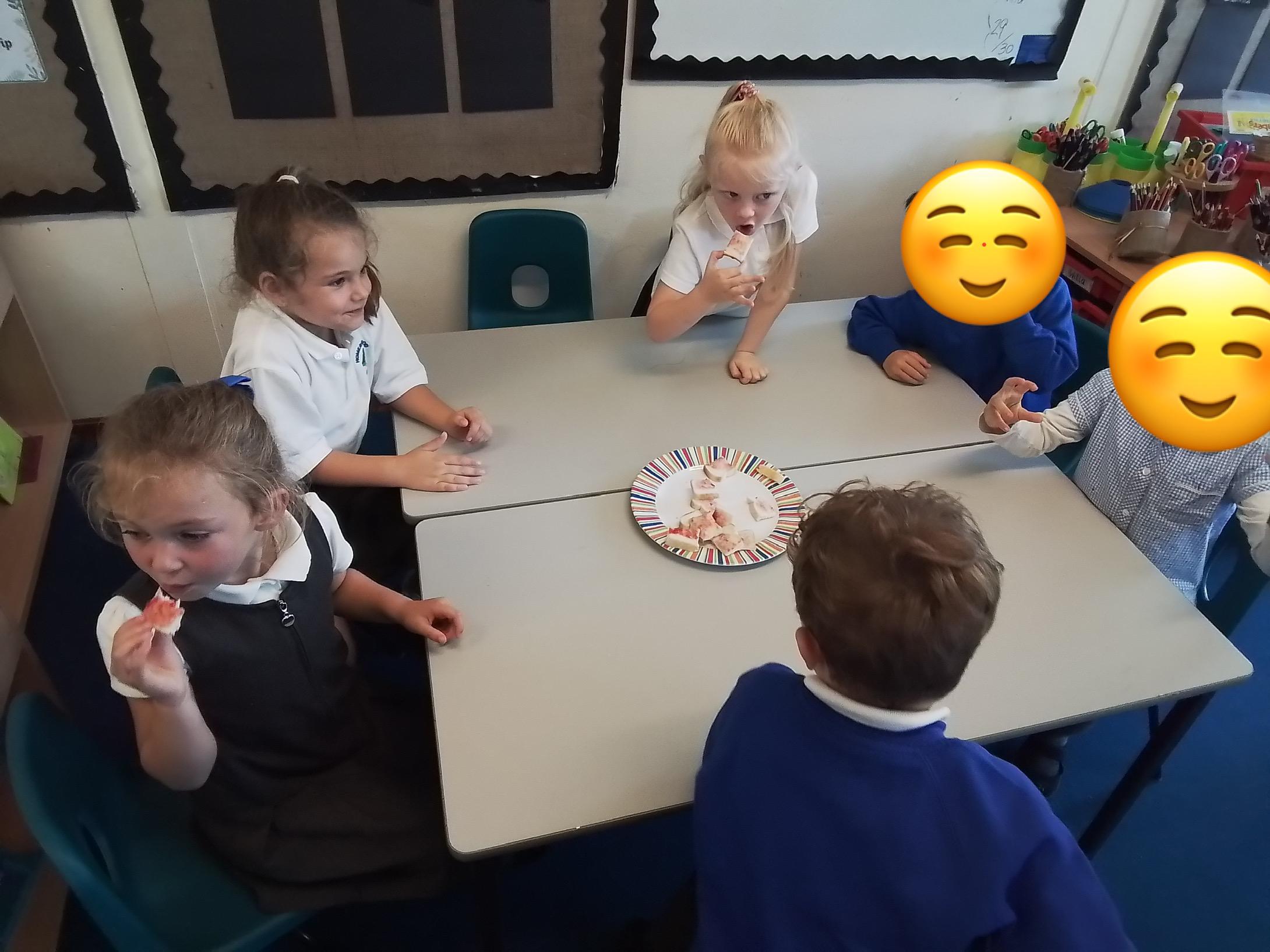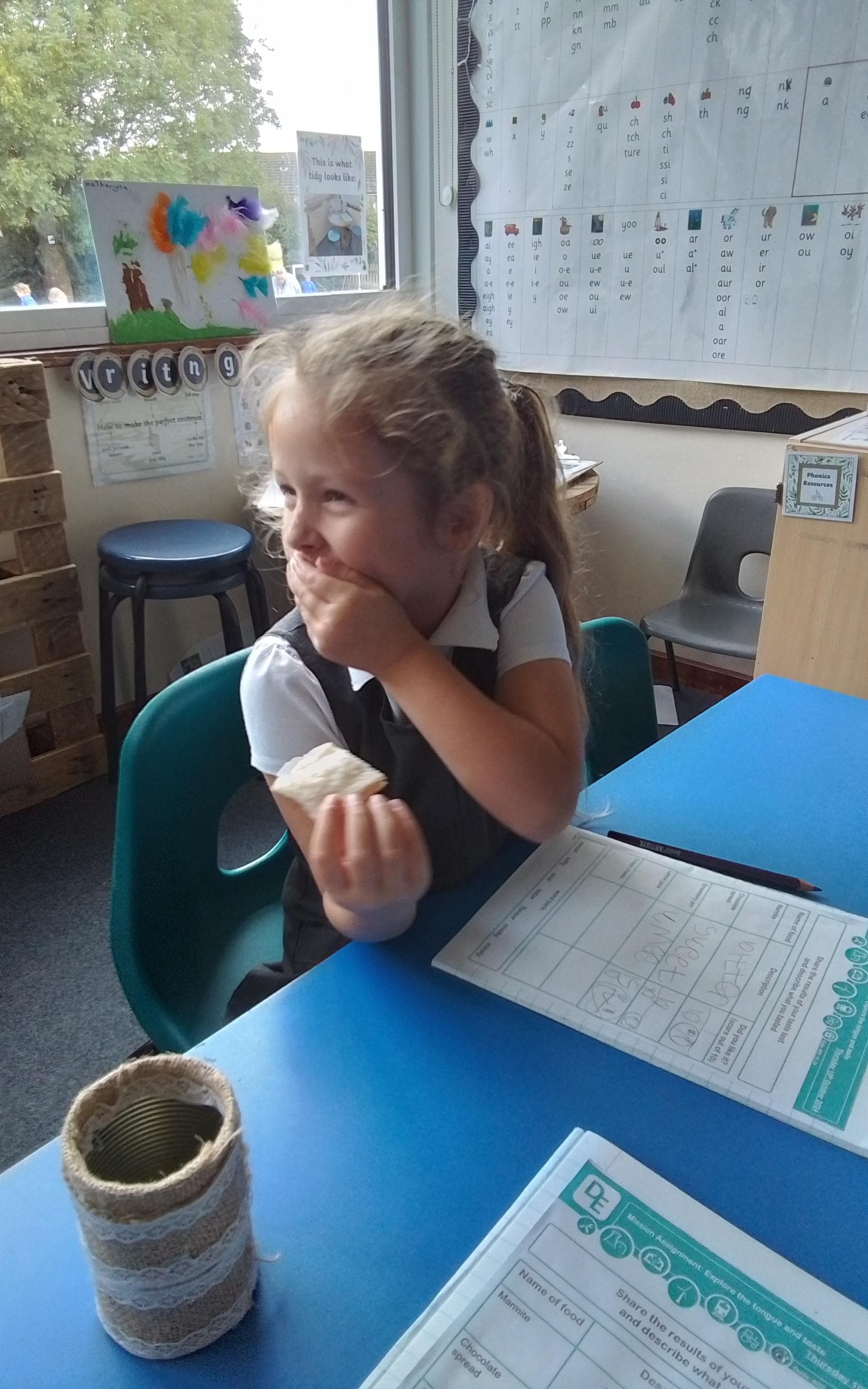Science - Today we explored our sense of taste by tasting some different foods on bread. We tried marmite, chocolate spread, strawberry jam, lemon juice and cream cheese, and described the flavours we could taste. We pulled some funny faces!