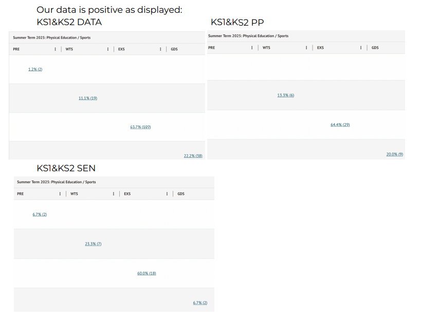 In particular, to highlight our EXS data in KS1 being 84% and KS2 being 71% are high proportions to demonstrate our dedication to PE. We will continue to support the WTS children to reach EXS and extend and challenge some of the EXS to reach their full potential at GDS where possible.