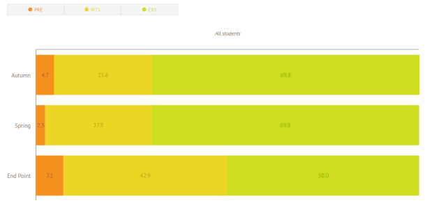 60.7% at EXS is positive, however we will focus on the 24.4% at WTS to ensure they have the opportunities to reach EXS as we continue through the year (Top bar: All students).