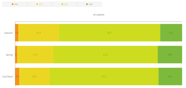 As the year has progressed, we can see that WTS percentage has dropped while we have an improvement of 1.9% with EXS attainment. Our whole school GDS is still steady around 14.1%